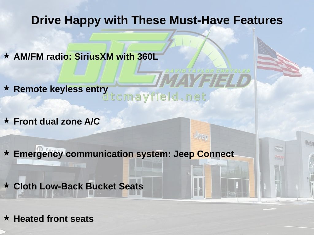 4G LTE Wi-Fi Hot Spot, AM/FM radio: SiriusXM with 360L, Apple CarPlay/Android Auto, Cloth Low-Back Bucket Seats, Emergency communication system: Jeep Connect, Front dual zone A/C, Front fog lights, Heated front seats, Heated steering wheel, ParkView Rear Back-Up Camera, Remote keyless entry, Wheels: 18" x 7.5" Machine/Painted Gray, 12.3" Touchscreen Display, 3.45 Overall Top Gear Ratio, 4-Wheel Disc Brakes, 8 Speakers, ABS brakes, Air Conditioning, Alloy wheels, Apple CarPlay, Automatic temperature control, Aux Battery, Body Color 3-Piece Hard Top, Brake assist, Compass, Connectivity - US/Canada, Delay-off headlights, Driver door bin, Driver vanity mirror, Dual front impact airbags, Dual front side impact airbags, Electronic Stability Control, For More Info, Call 800-643-2112, Freedom Panel Storage Bag, Front anti-roll bar, Front Bucket Seats, Front Center Armrest w/Storage, Front reading lights, Fully automatic headlights, Google Android Auto, Heated door mirrors, Illuminated entry, Integrated Center Stack Radio, Integrated roll-over protection, Low tire pressure warning, MOPAR All-Weather Floor Mats, Occupant sensing airbag, Outside temperature display, Overhead airbag, Panic alarm, Passenger door bin, Passenger vanity mirror, Power door mirrors, Power steering, Power windows, Quick Order Package 22G, Radio data system, Rear anti-roll bar, Rear reading lights, Rear Window Defroster, Rear Window Wiper/Washer, Security system, SiriusXM Radio Service, Speed control, Split folding rear seat, Steering wheel mounted audio controls, Stop-Start Dual Battery System, Tachometer, Telescoping steering wheel, Tilt steering wheel, Traction control, Trip computer, Variably intermittent wipers, Voltmeter, Wheels: 18" x 7.5 Machine/Painted Gray, 4G LTE Wi-Fi Hot Spot, AM/FM radio: SiriusXM with 360L, Apple CarPlay/Android Auto, Cloth Low-Back Bucket Seats, Emergency communication system: Jeep Connect, Front dual zone A/C, Front fog lights, Heated front seats, Heated steering wheel, ParkView Rear Back-Up Camera, Remote keyless entry, Wheels: 18" x 7.5" Machine/Painted Gray. Price does not include Tax, Title, or License fees. Price may include Manufacturer Rebates and Incentives. Buyer must meet certain conditions to qualify when applicable. $1000 - 2026 National Retail Bonus Cash . Exp. 04/30/2026 $1000 - 2026 National Stellantis Loyalty Bonus Cash . Exp. 04/30/2026 $500 - 2026 National 2026 First Responder Bonus Cash . Exp. 01/04/2027 $500 - 2026 National 2026 Military Bonus Cash . Exp. 01/04/2027