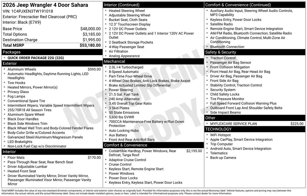 4G LTE Wi-Fi Hot Spot, AM/FM radio: SiriusXM with 360L, Apple CarPlay/Android Auto, Cloth Low-Back Bucket Seats, Emergency communication system: Jeep Connect, Front dual zone A/C, Front fog lights, Heated front seats, Heated steering wheel, ParkView Rear Back-Up Camera, Remote keyless entry, Wheels: 18" x 7.5" Machine/Painted Gray, 12.3" Touchscreen Display, 3.45 Overall Top Gear Ratio, 4-Wheel Disc Brakes, 8 Speakers, ABS brakes, Air Conditioning, Alloy wheels, Apple CarPlay, Automatic temperature control, Aux Battery, Body Color 3-Piece Hard Top, Brake assist, Compass, Connectivity - US/Canada, Delay-off headlights, Driver door bin, Driver vanity mirror, Dual front impact airbags, Dual front side impact airbags, Electronic Stability Control, For More Info, Call 800-643-2112, Freedom Panel Storage Bag, Front anti-roll bar, Front Bucket Seats, Front Center Armrest w/Storage, Front reading lights, Fully automatic headlights, Google Android Auto, Heated door mirrors, Heavy Duty Suspension w/Gas Shocks, Illuminated entry, Integrated Center Stack Radio, Integrated roll-over protection, Low tire pressure warning, MOPAR All-Weather Floor Mats, MyFlexCare Service Plan, Non-Lock Fuel Cap w/o Discriminator, Occupant sensing airbag, Outside temperature display, Overhead airbag, Panic alarm, Passenger door bin, Passenger vanity mirror, Power door mirrors, Power steering, Power windows, Quick Order Package 22G, Radio data system, Radio: Uconnect 5 w/12.3" Display, Rear anti-roll bar, Rear reading lights, Rear Window Defroster, Rear Window Wiper/Washer, Security system, SiriusXM Radio Service, SiriusXM w/360L, Speed control, Split folding rear seat, Steering wheel mounted audio controls, Stop-Start Dual Battery System, Tachometer, Telescoping steering wheel, Tilt steering wheel, Traction control, Trip computer, Variably intermittent wipers, Voltmeter, Wheels: 18" x 7.5 Machine/Painted Gray, 4G LTE Wi-Fi Hot Spot, AM/FM radio: SiriusXM with 360L, Apple CarPlay/Android Auto, Cloth Low-Back Bucket Seats, Emergency communication system: Jeep Connect, Front dual zone A/C, Front fog lights, Heated front seats, Heated steering wheel, ParkView Rear Back-Up Camera, Remote keyless entry, Wheels: 18" x 7.5" Machine/Painted Gray. Price does not include Tax, Title, or License fees. Price may include Manufacturer Rebates and Incentives. Buyer must meet certain conditions to qualify when applicable. $1000 - 2026 Great Lakes BC Loyalty Bonus Cash. Exp. 03/02/2026 $1000 - 2026 National Stellantis Loyalty Bonus Cash . Exp. 03/02/2026 $500 - 2026 National 2026 First Responder Bonus Cash . Exp. 01/04/2027