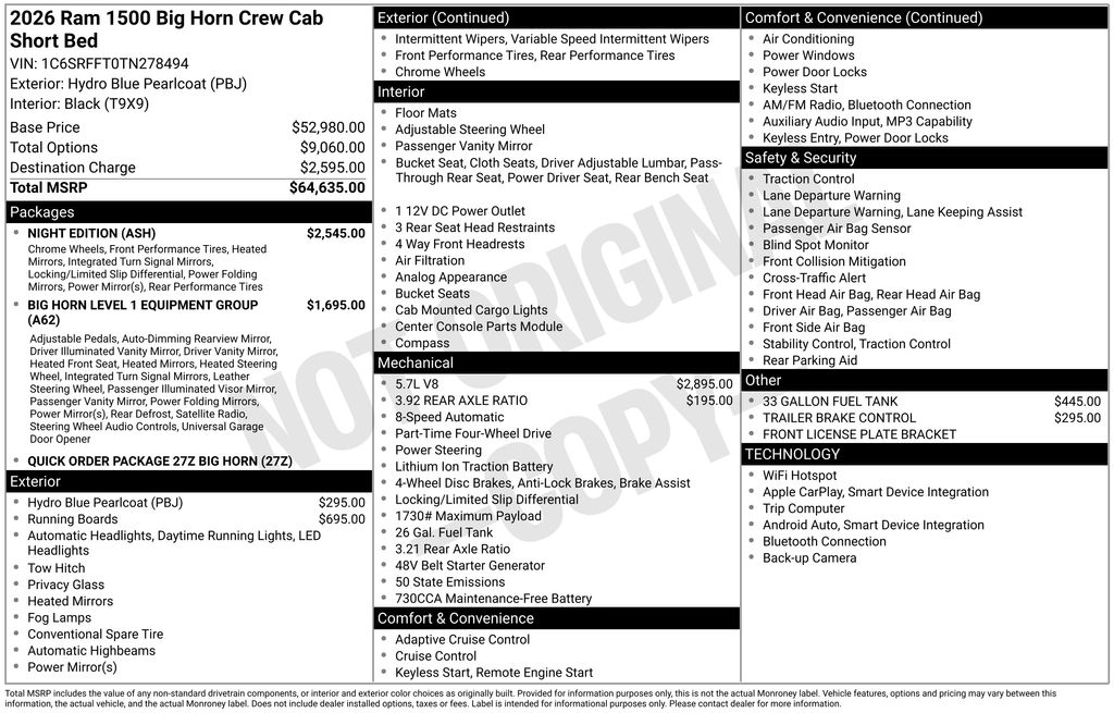 115V Auxiliary Power Outlet, 2nd Row in Floor Storage Bins, 3 Rear Seat Head Restraints, 33 Gallon Fuel Tank, 4 Way Front Headrests, 4-Wheel Disc Brakes, 400W Inverter, 48V Belt Starter Generator, 4G LTE Wi-Fi Hot Spot, 6 Speakers, ABS brakes, Accent Color Door Handles, Accent Color Premium Power Mirrors, Accent Color Tailgate Handle, Air Conditioning, Alloy wheels, AM/FM radio, Anti-Spin Differential Rear Axle, Apple CarPlay, Apple CarPlay/Android Auto, Auto High-beam Headlights, Auto Power-Folding Mirrors, Auto-Dimming Exterior Driver Mirror, Auto-Dimming Rear-View Mirror, Big Horn Level 1 Equipment Group, Black Exterior Mirrors, Black Exterior Truck Badging, Black Headlamp Bezels, Black Interior Accents, Black Painted Exterior Mirrors Caps, Black Premium Power Mirrors, Black Tail Lamp Bezels, Body Color Fender Flares, Body Color Front Bumper, Body Color Rear Bumper with Step Pads, Brake assist, Bucket Seats, Bumpers: chrome, Center Console Parts Module, Cloth Bucket Seats, Compass, Connectivity - US/Canada, Convex Wide-Angle Exterior Mirror Insert, Delay-off headlights, Deluxe Cloth Bucket Seats, Driver door bin, Dual Exhaust with Black Tips, Dual front impact airbags, Dual front side impact airbags, Electronic Stability Control, Exterior Mirrors Courtesy Lamps, Exterior Mirrors with Heating Element, Exterior Mirrors with Supplemental Signals, Front anti-roll bar, Front Bucket Seats, Front Center Armrest w/Storage, Front fog lights, Front License Plate Bracket, Front reading lights, Front Seat Back Map Pockets, Front wheel independent suspension, Full Length Floor Console, Fully automatic headlights, Global Telematics Box Module, Glove Box Lamp, Google Android Auto, GPS Antenna Input, Grille Black Surround Black Mesh, Heated door mirrors, Heated Front Seats, Heated Steering Wheel, Illuminated entry, Integrated Center Stack Radio, Integrated Voice Command with Bluetooth, Leather Wrapped Steering Wheel, Low tire pressure warning, Manual Adjust 4-Way Driver Seat, Manual Adjust 4-Way Front Passenger Seat, Manual Folding Exterior Mirrors, Mopar Black Tubular Side Steps, Night Edition, Occupant sensing airbag, Outside temperature display, Overhead airbag, Overhead console, Panic alarm, ParkView Rear Back-Up Camera, Passenger door bin, Passenger vanity mirror, Power 2-Way Driver Lumbar Adjust, Power Adjust 8-Way Driver Seat, Power Adjustable Pedals, Power door mirrors, Power steering, Power windows, Quick Order Package 27Z Big Horn, Radio data system, Radio: Uconnect 5 W with 8.4" Display, RAM Grille Badge - Black, RAM Grille Badge - Chrome, Rear 60/40 Folding Seat, Rear anti-roll bar, Rear Center Armrest, Rear Dome with on/Off Switch Lamp, Rear Power Sliding Window, Rear step bumper, Rear Window Defroster, Remote keyless entry, SiriusXM Radio Service, SiriusXM Satellite Radio, Speed control, Steering Wheel Mounted Audio Controls, Sun Visors with Illuminated Vanity Mirrors, Supplier Part Tracking (J-1), Tachometer, Telescoping steering wheel, Tilt steering wheel, Traction control, Trailer Brake Control, Trip computer, Universal Garage Door Opener, USB Host Flip, Variably intermittent wipers, Voltmeter, Wheels: 20" x 9.0" Aluminum Painted Clad. Price does not include Tax, Title, or License fees. Price may include Manufacturer Rebates and Incentives. Buyer must meet certain conditions to qualify when applicable. $2000 - 2026 South BC Conquest Bonus Cash . Exp. 01/20/2026 $3500 - 2026 National Retail Consumer Cash . Exp. 02/02/2026 $500 - 2026 National 2026 Military Bonus Cash . Exp. 01/04/2027