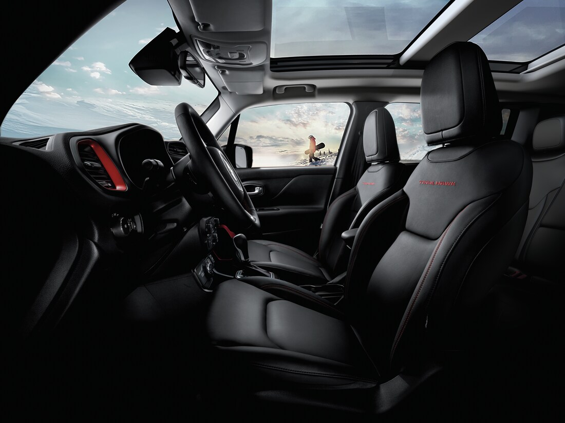 The Jeep Renegade is a smaller crossover SUV that offers comfortable seating for five passengers. You can expect the entry-level Jeep Renegade models to sport cloth seats, dual-zone climate control, power windows, and a push-button start. Get even more upgrades and a luxury experience with add-on packages that include leather upholstery, heated seats, a heated steering wheel, and more powered seat adjustments.