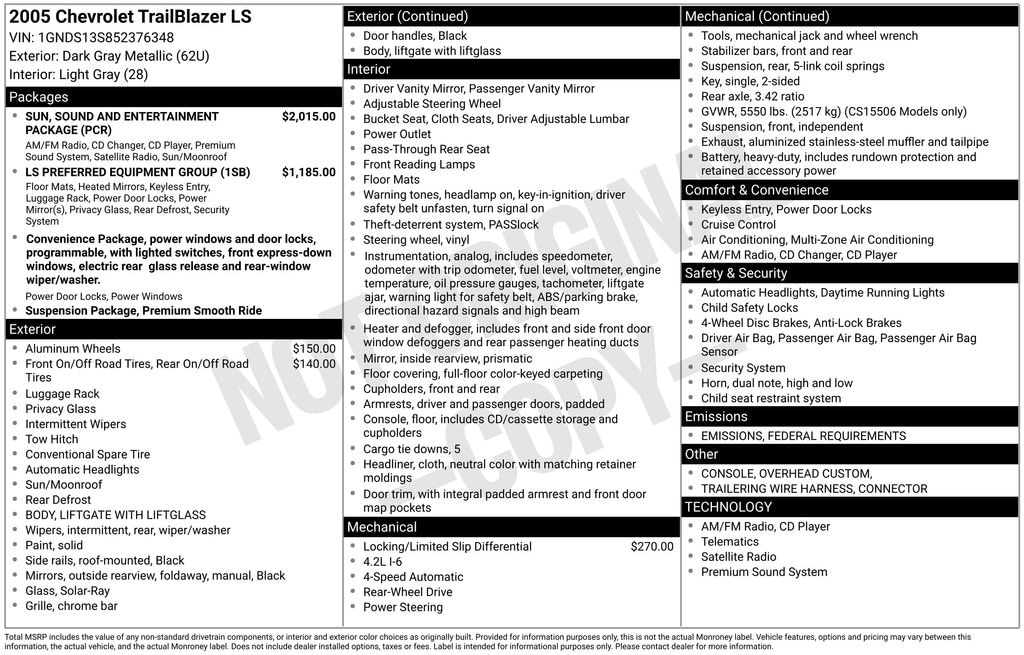 2005 Chevrolet TrailBlazer LS RWD 4-Speed Automatic with Overdrive Vortec 4200 4.2L I6 MPI DOHC Dark Gray Metallic