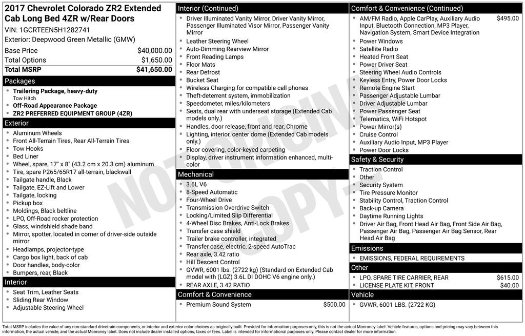17" x 8" Aluminum Wheels, 3.42 Rear Axle Ratio, 4-Way Power Front Passenger Seat Adjuster, 4-Wheel Disc Brakes, 6 Speakers, 6-Speaker Audio System Feature, ABS brakes, Air Conditioning, Alloy wheels, AM/FM radio: SiriusXM, Apple CarPlay, Auto-dimming Rear-View mirror, Automatic temperature control, Black Rear Bumpers, Black Spray-On Bedliner w/Chevrolet Logo, Bose Premium 7-Speaker Audio System Feature, Compass, Delay-off headlights, Driver 4-Way Power Seat Adjuster, Driver door bin, Driver vanity mirror, Driver-Selectable Full-Locking Front Differential, Driver-Selectable Full-Locking Rear Differential, Dual front impact airbags, Dual front side impact airbags, Electronic Stability Control, Emergency communication system: OnStar Guidance, Exterior Parking Camera Rear, Front anti-roll bar, Front Bucket Seats, Front Center Armrest, Front fog lights, Front License Plate Kit, Front reading lights, Front wheel independent suspension, Fully automatic headlights, Heated Driver & Front Passenger Seats, Heated front seats, Heavy-Duty Trailering Package, Illuminated entry, Integrated Trailer Brake Controller, Leather-Appointed Seat Trim, Low tire pressure warning, Occupant sensing airbag, Off-Road Appearance Package, Off-Road Rocker Protection (LPO), Outside temperature display, Overhead airbag, Overhead console, Panic alarm, Passenger door bin, Passenger vanity mirror, Power door mirrors, Power Driver Lumbar Control Seat Adjuster, Power driver seat, Power Passenger Lumbar Control Seat Adjuster, Power passenger seat, Power steering, Power windows, Preferred Equipment Group 4ZR, Premium audio system: Chevrolet MyLink, Radio data system, Radio: AM/FM Stereo w/8" Diagonal Color Touch Nav., Radio: AM/FM Stereo w/8" Diagonal Color Touch Screen, Rear step bumper, Rear window defroster, Remote keyless entry, Security system, SiriusXM Satellite Radio, Speed control, Speed-sensing steering, Split folding rear seat, Steering wheel mounted audio controls, Tachometer, Telescoping steering wheel, Tilt steering wheel, Tow/Haul Mode, Traction control, Trip computer, Variably intermittent wipers.