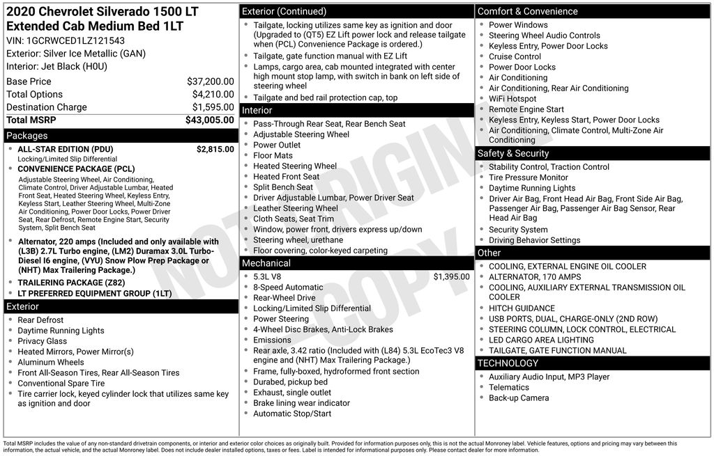 10-Way Power Driver Seat w/Lumbar, 12-Volt Rear Auxiliary Power Outlet, 170 Amps Alternator, 2 USB Ports (First Row), 220 Amps Alternator, 3.23 Rear Axle Ratio, 4-Way Manual Driver Seat Adjuster, 4-Wheel Disc Brakes, 4.2" Diagonal Color Display Driver Info Center, 40/20/40 Front Split Bench Seat, 40/20/40 Front Split-Bench Seat, 4G LTE Wi-Fi Hot Spot Capable, 6 Speakers, ABS brakes, Air Conditioning, All-Star Edition, Alloy wheels, Apple CarPlay/Android Auto, Auxiliary External Transmission Oil Cooler, Bluetooth® For Phone, Brake assist, Bumpers: chrome, Chevrolet Connected Access Capable, Chrome Grille, Chrome Mirror Caps, Cloth Seat Trim, Color-Keyed Carpeting Floor Covering, Compass, Convenience Package, Deep-Tinted Glass, Delay-off headlights, Driver door bin, Driver vanity mirror, Dual front impact airbags, Dual front side impact airbags, Dual-Zone Automatic Climate Control, Electric Rear-Window Defogger, Electrical Lock Control Steering Column, Electronic Stability Control, External Engine Oil Cooler, EZ Lift Power Lock & Release Tailgate, Front anti-roll bar, Front Center Armrest w/Storage, Front reading lights, Front Rubberized Vinyl Floor Mats, Front wheel independent suspension, Fully automatic headlights, Heated door mirrors, Heated Driver & Front Outboard Passenger Seats, Heated Steering Wheel, Heavy Duty Suspension, Heavy-Duty Rear Locking Differential, Hitch Guidance, Illuminated entry, Keyless Open & Start, Leather Wrapped Steering Wheel, LED Cargo Area Lighting, Locking Tailgate, Low tire pressure warning, Manual Tilt-Wheel Steering Column, Manual Tilt/Telescoping Steering Column, Occupant sensing airbag, OnStar & Chevrolet Connected Services Capable, Outside temperature display, Overhead airbag, Overhead console, Panic alarm, Passenger door bin, Passenger vanity mirror, Power Door Locks, Power door mirrors, Power Front Windows w/Driver Express Up/Down, Power Front Windows w/Passenger Express Down, Power Rear Windows w/Express Down, Power steering, Power windows, Preferred Equipment Group 1LT, Radio data system, Radio: Chevrolet Infotainment 3 System, Rear 60/40 Folding Bench Seat (Folds Up), Rear Dual USB Charging-Only Ports, Rear reading lights, Rear Rubberized-Vinyl Floor Mats, Rear step bumper, Rear Vision Camera, Remote Keyless Entry, Remote keyless entry, Remote Vehicle Starter System, Single-Zone Manual/Semi-Automatic Air Conditioning, Speed control, Speed-sensing steering, Split folding rear seat, Steering Wheel Audio Controls, Steering wheel mounted audio controls, Steering Wheel Mounted Electronic Cruise Control, Tachometer, Theft Deterrent System (Unauthorized Entry), Tilt steering wheel, Traction control, Trailering Package, Trip computer, Urethane Steering Wheel, Variably intermittent wipers, Voltmeter, Wheels: 17" x 8" Bright Silver Painted Aluminum.