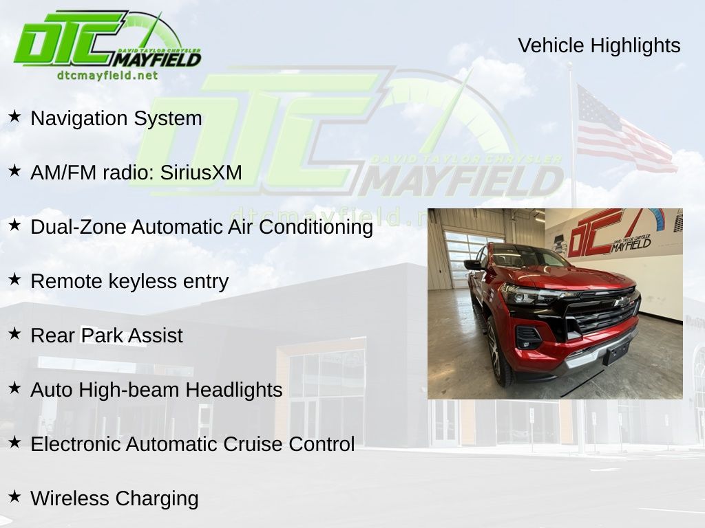 AM/FM radio: SiriusXM, Apple CarPlay/Android Auto, Auto High-beam Headlights, Blind Zone Steering Assist w/Trailering, Cloth/Evotex Seat Trim, Dual-Zone Automatic Air Conditioning, Electronic Automatic Cruise Control, Front Bucket Seats, Heated Driver & Front Passenger Seats, Lane Keep Assist w/Lane Departure Warning, Navigation System, Rear Park Assist, Remote keyless entry, Wireless Charging, 220 Amp Generator, 3.42 Rear Axle Ratio, 4-Way Manual Passenger Seat Adjuster, 4-Wheel Disc Brakes, 6 Speakers, 6-Speaker Audio System Feature, 6-Way Manual Driver Seat Adjuster, 8-Way Power Driver Seat Adjuster, ABS brakes, Advanced Trailering Package, Air Conditioning, Alloy wheels, Automatic Emergency Braking, Black Spray-On Bedliner w/Chevrolet Logo, Brake assist, Bumpers: body-color, Chevy Safety Assist, Compass, Delay-off headlights, Driver door bin, Driver vanity mirror, Dual front impact airbags, Dual front side impact airbags, Electronic Stability Control, EZ-Lift & Lower Tailgate, Following Distance Indicator, Forward Collision Alert, Front anti-roll bar, Front Center Armrest, Front fog lights, Front License Plate Kit, Front Passenger Seatback Map Pocket, Front Pedestrian & Bicyclist Braking, Front reading lights, Front wheel independent suspension, Heated door mirrors, Heavy-Duty Trailering Package, Illuminated entry, Inside Rear-View Auto-Dimming Mirror, Integrated Trailer Brake Controller, IntelliBeam Automatic High Beam On/Off, Low tire pressure warning, Occupant sensing airbag, Outside temperature display, Overhead airbag, Overhead console, Panic alarm, Passenger door bin, Passenger vanity mirror, Power door mirrors, Power Driver Lumbar Control Seat Adjuster, Power steering, Power windows, Preferred Equipment Group 4Z7, Radio data system, Radio: 11.3" Diagonal Advanced Color LCD Display, Rear Cross Traffic Braking, Rear reading lights, Rear step bumper, Rear window defroster, Rear-Window Electric Defogger, Red Seat Belt, Remote Vehicle Starter System, Safety Package, Security system, SiriusXM Radio, Speed control, Speed-sensing steering, Split folding rear seat, Steering Wheel Mounted Audio Controls, Steering wheel mounted audio controls, StowFlex Tailgate Storage Compartment, Tachometer, Tailgate Keyed Cylinder Lock, Tilt & Telescoping Steering Column, Tilt steering wheel, Traction control, Trailering App, Trip computer, Variably intermittent wipers, Wheels: 18" x 8.5" Android Dark Full Gloss Aluminum, Wheels: 20" x 9" Dark Android Aluminum, Wireless Phone Projection, Z71 Convenience Package II, AM/FM radio: SiriusXM, Apple CarPlay/Android Auto, Auto High-beam Headlights, Blind Zone Steering Assist w/Trailering, Cloth/Evotex Seat Trim, Dual-Zone Automatic Air Conditioning, Electronic Automatic Cruise Control, Front Bucket Seats, Heated Driver & Front Passenger Seats, Lane Keep Assist w/Lane Departure Warning, Navigation System, Rear Park Assist, Remote keyless entry, Wireless Charging.