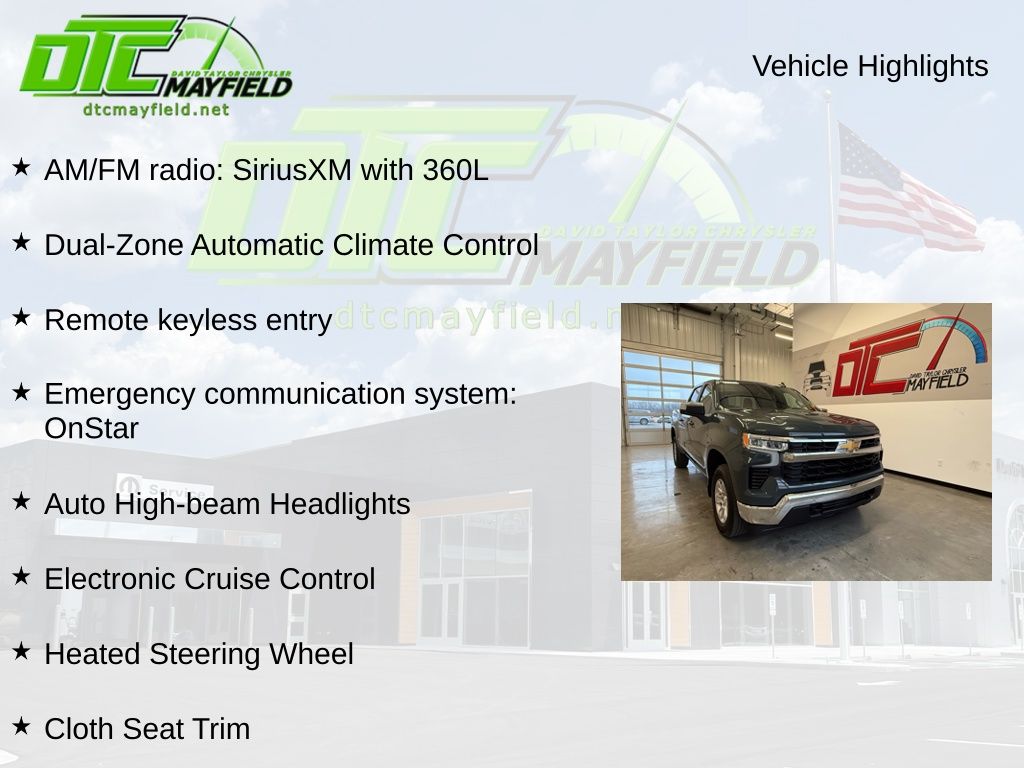 AM/FM radio: SiriusXM with 360L, Apple CarPlay/Android Auto, Auto High-beam Headlights, Cloth Seat Trim, Dual-Zone Automatic Climate Control, Electronic Cruise Control, Emergency communication system: OnStar, Heated Driver & Front Outboard Passenger Seats, Heated Steering Wheel, Lane Keep Assist w/Lane Departure Warning, Remote keyless entry, Wi-Fi Hot Spot Capable, 10-Way Power Driver Seat w/Lumbar, 12.3" Multicolor Reconfigurable Digital Display, 120-Volt Bed Mounted Power Outlet, 120-Volt Interior Power Outlet, 220 Amp Alternator, 4-Wheel Disc Brakes, 40/20/40 Front Split-Bench Seat, 6 Speakers, 6-Speaker Audio System, ABS brakes, Air Conditioning, All-Star Edition, Alloy wheels, Auto-Locking Rear Differential, Automatic Emergency Braking, Automatic temperature control, Bluetooth® For Phone, Brake assist, Bumpers: chrome, Chrome Mirror Caps, Color-Keyed Carpeting Floor Covering, Compass, Convenience Package, Deep-Tinted Glass, Delay-off headlights, Driver door bin, Driver vanity mirror, Dual front impact airbags, Dual front side impact airbags, Dual Rear USB Ports (Charge Only), Electric Rear-Window Defogger, Electronic Stability Control, EZ Lift Power Lock & Release Tailgate, Following Distance Indicator, Forward Collision Alert, Front anti-roll bar, Front Center Armrest w/Storage, Front dual zone A/C, Front Frame-Mounted Black Recovery Hooks, Front Pedestrian Braking, Front reading lights, Front Rubberized Vinyl Floor Mats, Front wheel independent suspension, Fully automatic headlights, HD Rear Vision Camera, Heated door mirrors, Heated front seats, Heated Power-Adjustable Outside Mirrors, Heated steering wheel, Hitch Guidance, Illuminated entry, Inside Rear-View Mirror w/Tilt, Integrated Trailer Brake Controller, IntelliBeam Automatic High Beam On/Off, Keyless Open & Start, LED Cargo Area Lighting, Low tire pressure warning, Manual Tilt/Telescoping Steering Column, Occupant sensing airbag, OnStar Services Capable, Outside temperature display, Overhead airbag, Overhead console, Panic alarm, Passenger door bin, Passenger vanity mirror, Power door mirrors, Power driver seat, Power Front Windows w/Driver Express Up/Down, Power Front Windows w/Passenger Express Down, Power Rear Windows w/Express Down, Power steering, Power windows, Premium audio system: Chevrolet Infotainment 3 Premium, Radio data system, Radio: Chevrolet Infotainment 3 Premium System, Rear 60/40 Folding Bench Seat (Folds Up), Rear reading lights, Rear Rubberized-Vinyl Floor Mats, Rear step bumper, Rear window defroster, Remote Start Package, Remote Vehicle Starter System, Security system, SiriusXM w/360L Trial Subscription, Speed control, Speed-sensing steering, Split folding rear seat, Standard Suspension Package, Standard Tailgate, Steering Wheel Audio Controls, Steering wheel mounted audio controls, Tachometer, Teen Driver, Telescoping steering wheel, Theft Deterrent System (Unauthorized Entry), Tilt steering wheel, Tire Pressure Monitoring System, Traction control, Trailering Package, Trip computer, Variably intermittent wipers, Voltmeter, Wheels: 17" x 8" Bright Silver Painted Aluminum, Wrapped Steering Wheel, AM/FM radio: SiriusXM with 360L, Apple CarPlay/Android Auto, Auto High-beam Headlights, Cloth Seat Trim, Dual-Zone Automatic Climate Control, Electronic Cruise Control, Emergency communication system: OnStar, Heated Driver & Front Outboard Passenger Seats, Heated Steering Wheel, Lane Keep Assist w/Lane Departure Warning, Remote keyless entry, Wi-Fi Hot Spot Capable.