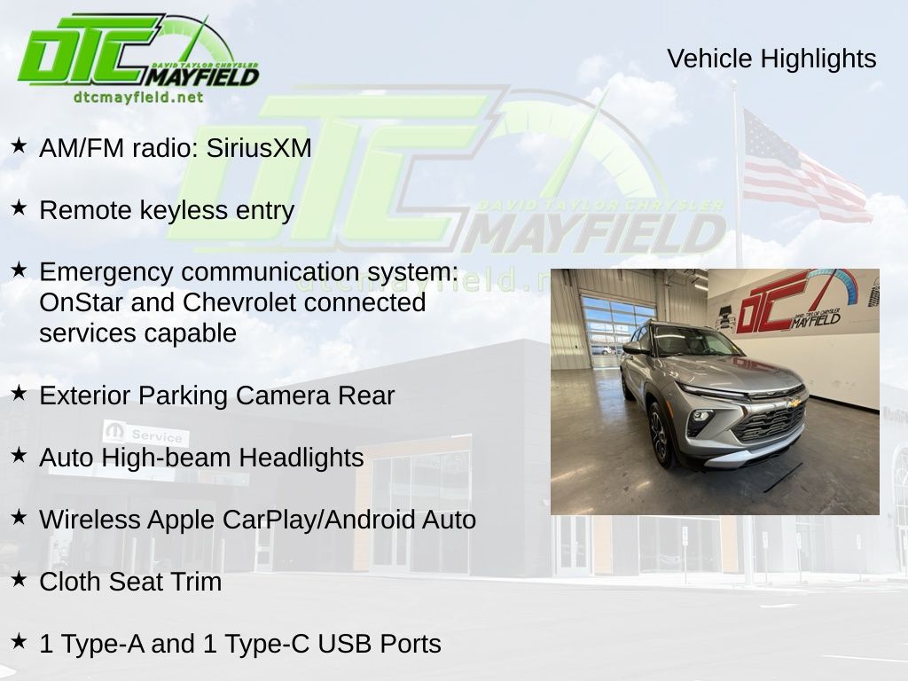 1 Type-A and 1 Type-C USB Ports, AM/FM radio: SiriusXM, Auto High-beam Headlights, Cloth Seat Trim, Emergency communication system: OnStar and Chevrolet connected services capable, Exterior Parking Camera Rear, Front Bucket Seats, Remote keyless entry, Wireless Apple CarPlay/Android Auto, 3.17 Final Drive Axle Ratio, 4-Way Manual Front Passenger Seat Adjuster, 4-Wheel Disc Brakes, 6 Speakers, 6-Speaker Audio System Feature with Amplifier, 6-Way Manual Driver Seat Adjuster, ABS brakes, Air Conditioning, Alloy wheels, Brake assist, Bumpers: body-color, Compass, Delay-off headlights, Driver door bin, Driver vanity mirror, Dual front impact airbags, Dual front side impact airbags, Electronic Stability Control, Flat-Folding Front Passenger Seatback, Front anti-roll bar, Front Center Armrest, Front reading lights, Front wheel independent suspension, Fully automatic headlights, Heated door mirrors, Illuminated entry, Knee airbag, Low tire pressure warning, Occupant sensing airbag, Overhead airbag, Overhead console, Panic alarm, Passenger door bin, Passenger vanity mirror, Power door mirrors, Power steering, Power windows, Radio data system, Radio: AM/FM Stereo Audio System, Rear side impact airbag, Rear window defroster, Rear window wiper, Ride and Handling Suspension, Security system, SiriusXM Trial Subscription, Speed control, Split folding rear seat, Spoiler, Steering wheel mounted audio controls, Tachometer, Telescoping steering wheel, Tilt steering wheel, Traction control, Trip computer, Variably intermittent wipers, Wheels: 17" High Gloss Black Machined Aluminum, 1 Type-A and 1 Type-C USB Ports, AM/FM radio: SiriusXM, Auto High-beam Headlights, Cloth Seat Trim, Emergency communication system: OnStar and Chevrolet connected services capable, Exterior Parking Camera Rear, Front Bucket Seats, Remote keyless entry, Wireless Apple CarPlay/Android Auto.
