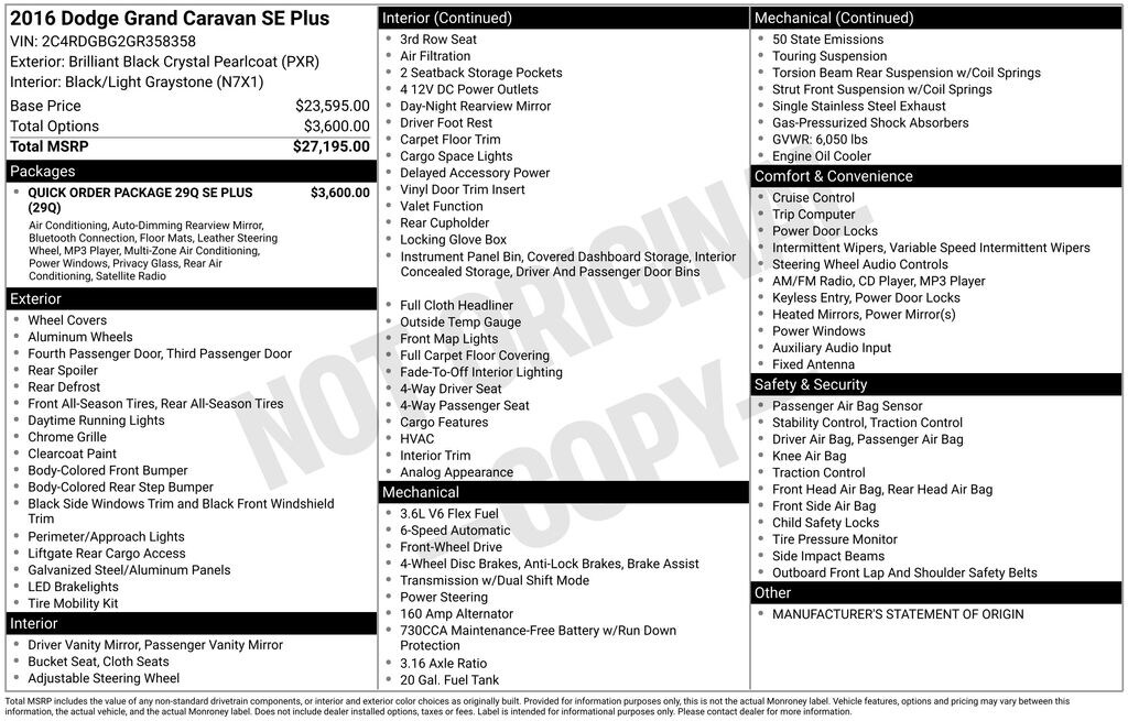 17" Wheel Covers, 17" x 6.5" Painted Aluminum Wheels, 17" x 6.5" Steel Wheels, 2nd Row Bench w/Rear Stow 'N Go 60/40, 3.16 Axle Ratio, 3rd row seats: split-bench, 4 Speakers, 4-Wheel Disc Brakes, ABS brakes, Air Conditioning, AM/FM radio, Anti-whiplash front head restraints, Body Color Exterior Mirrors, Bodyside moldings, Brake assist, Bumpers: body-color, CD player, Cloth Low-Back Bucket Seats, Delay-off headlights, Driver door bin, Driver vanity mirror, Driver's Seat Mounted Armrest, Dual front impact airbags, Dual front side impact airbags, Electronic Stability Control, Front anti-roll bar, Front Bucket Seats, Front dual zone A/C, Front reading lights, Front wheel independent suspension, Heated door mirrors, Illuminated entry, Knee airbag, Low tire pressure warning, Manufacturer's Statement of Origin, Occupant sensing airbag, Outside temperature display, Overhead airbag, Overhead console, Panic alarm, Passenger door bin, Passenger seat mounted armrest, Passenger vanity mirror, Power door mirrors, Power Quarter Vented Windows, Power steering, Power windows, Premium Cloth Bucket Seats, Quick Order Package 29Q SE Plus, Radio: 130, Rear window defroster, Rear window wiper, Reclining 3rd row seat, Remote keyless entry, Speed control, Spoiler, Steering Wheel Mounted Audio Controls, Steering wheel mounted audio controls, Sunscreen Glass, Tachometer, Telescoping steering wheel, Tilt steering wheel, Touring Suspension, Traction control, Trip computer, Variably intermittent wipers.