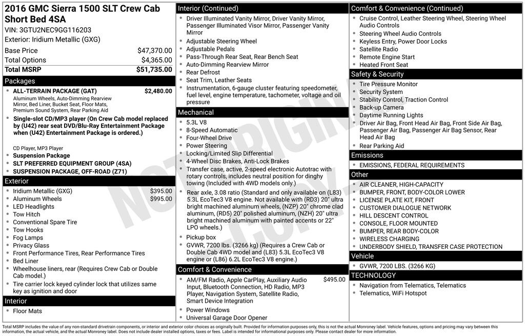 10-Way Power Driver's Seat Adjuster, 110-Volt AC Power Outlet, 150 Amp Alternator, 1st & 2nd Row Color-Keyed Carpeted Floor Mats, 2-Speed Active Electronic AutoTrac Transfer Case, 4-Wheel Disc Brakes, 4.2" Diagonal Color Display Driver Info Center, 40/20/40 Front Split Bench Seat, 6 Speakers, 6-Speaker Audio System, ABS brakes, Adjustable pedals, Air Conditioning, All-Terrain Package, Alloy wheels, AM/FM radio: SiriusXM, Auto-dimming door mirrors, Auto-Dimming Inside Rear-View Mirror, Auto-dimming Rear-View mirror, Automatic temperature control, Auxiliary External Transmission Oil Cooler, Body Color Front Bumper, Body Color Rear Bumper w/Cornersteps, Bodyside moldings, Bose Speaker System, Brake assist, Bumpers: chrome, CD player, Chrome Bodyside Moldings, Chrome Door Handles, Chrome Mirror Caps, Color-Keyed Carpeting w/Rubberized Vinyl Floor Mats, Compass, Deep-Tinted Glass, Delay-off headlights, Driver & Front Passenger Illuminated Vanity Mirrors, Driver door bin, Driver vanity mirror, Dual front impact airbags, Dual front side impact airbags, Dual-Zone Automatic Climate Control, Electric Rear-Window Defogger, Electronic Stability Control, Emergency communication system: OnStar Guidance, Exterior Parking Camera Rear, EZ Lift & Lower Tailgate, Floor Mounted Console, Front anti-roll bar, Front Center Armrest w/Storage, Front dual zone A/C, Front fog lights, Front Frame-Mounted Black Recovery Hooks, Front Full Feature Power Reclining Bucket Seats, Front License Plate Kit, Front reading lights, Front wheel independent suspension, Fully automatic headlights, Garage door transmitter: HomeLink, HD Radio, Heated door mirrors, Heated Driver & Front Passenger Seats, Heated front seats, Heavy Duty Suspension, Heavy-Duty Rear Locking Differential, High-Performance LED Headlamps, Hill Descent Control, Illuminated entry, Leather Appointed Seat Trim, Leather Wrapped Steering Wheel w/Cruise Controls, LED Cargo Box Lighting, LED Tailamps w/Signature, Low tire pressure warning, Manual Tilt/Telescoping Steering Column, Memory seat, Occupant sensing airbag, Off-Road Suspension Package, OnStar 6 Month Guidance Plan, OnStar w/4G LTE, Outside temperature display, Overhead airbag, Overhead console, Panic alarm, Passenger door bin, Passenger vanity mirror, Power Adjustable Pedals, Power door mirrors, Power driver seat, Power Folding & Adjustable Heated Outside Mirrors, Power passenger seat, Power steering, Power windows, Power Windows w/Driver Express Up & Down, Preferred Equipment Group 4SA, Premium audio system: IntelliLink, Radio data system, Radio: AM/FM Stereo w/8" Diagonal Color Touch Nav., Radio: AM/FM Stereo w/8" Diagonal Color Touch Screen, Rear 60/40 Folding Bench Seat (Folds Up), Rear reading lights, Rear seat center armrest, Rear step bumper, Rear Vision Camera w/Dynamic Guide Lines, Rear Wheelhouse Liners, Rear window defroster, Remote Keyless Entry, Remote keyless entry, Remote Vehicle Starter System, Security system, Single Slot CD/MP3 Player, SiriusXM Satellite Radio, Speed control, Speed-sensing steering, Split folding rear seat, Spray-On Pickup Box Bed Liner, Steering Wheel Audio Controls, Steering wheel mounted audio controls, Tachometer, Telescoping steering wheel, Theft Deterrent System (Unauthorized Entry), Thin Profile LED Front Fog Lamps, Tilt steering wheel, Traction control, Trailering Equipment, Trip computer, Turn signal indicator mirrors, Ultrasonic Rear Park Assist, Unique Body Color Grille Surround w/Chrome Accents, Universal Home Remote, Variably intermittent wipers, Voltmeter, Wheels: 18" x 8.5" Bright Machined Aluminum, Wheels: 18" x 8.5" Polished Aluminum, Wheels: 20" x 9" Ultra Bright Machined Alum., Wireless Charging.
