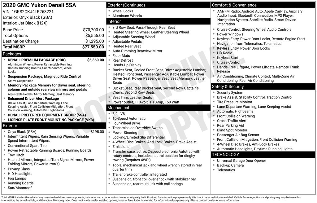 10 Speakers, 3.23 Rear Axle Ratio, 3rd row seats: split-bench, 4-Wheel Antilock Disc Brakes, 4-Wheel Disc Brakes, 5 Auxiliary 12-volt Power Outlets, ABS brakes, Adaptive suspension, Adjustable pedals, Air Conditioning, Alloy wheels, AM/FM radio: SiriusXM, Apple CarPlay/Android Auto, Auto High-beam Headlights, Auto-dimming door mirrors, Auto-dimming Rear-View mirror, Auto-leveling suspension, Automatic Emergency Braking, Automatic temperature control, Black Assist Steps w/Chrome Strip, Bodyside moldings, Bose Active Noise Cancellation, Bose Centerpoint Surround Sound Audio System, Brake assist, Bumpers: body-color, CD Player, CD player, Compass, Delay-off headlights, Denali Premium Package, Driver door bin, Driver vanity mirror, Dual front impact airbags, Dual front side impact airbags, Electronic Stability Control, Emergency communication system: OnStar and GMC connected services capable, Enhanced Driver Alert Package, Exterior Parking Camera Rear, Forward Collision Alert, Front anti-roll bar, Front Bucket Seats, Front Center Armrest, Front dual zone A/C, Front fog lights, Front reading lights, Front wheel independent suspension, Full-Feature Reclining Bucket Seats, Fully automatic headlights, Garage door transmitter, Genuine wood console insert, Genuine wood dashboard insert, Genuine wood door panel insert, Hands Free Power Programmable Rear Liftgate, Heads-Up Display, Heated & Ventilated Driver & Front Passenger Seats, Heated door mirrors, Heated front seats, Heated Leather-Wrapped Steering Wheel, Heated rear seats, Heated steering wheel, High-Intensity Discharge Headlights, Illuminated entry, Inside Rear-View Auto-Dimming Mirror, Integrated Trailer Brake Controller, IntelliBeam Automatic High Beam On/Off, Lane Change Alert w/Side Blind Zone Alert, Lane Keep Assist w/Lane Departure Warning, Leather Shift Knob, Leather steering wheel, License Plate Front Mounting Package, Low tire pressure warning, Magnetic Ride Control Suspension Package, Memory Package, Memory seat, Navigation System, Occupant sensing airbag, Outside temperature display, Overhead airbag, Overhead console, Panic alarm, Passenger door bin, Passenger vanity mirror, Passive Entry System, Pedal memory, Perforated Leather-Appointed Seat Trim, Power door mirrors, Power driver seat, Power Liftgate, Power passenger seat, Power Release 2nd Row Bucket Seats, Power steering, Power Tilt & Telescopic Steering Column, Power Tilt-Sliding Sunroof w/Express-Open/Close, Power windows, Power-Adjustable Pedals For Accelerator & Brake, Preferred Equipment Group 5SA, Premium audio system: IntelliLink, Push Button Keyless Start, Pwr Retractable Assist Steps w/Perimeter Lighting, Radio: AM/FM/SiriusXM w/Navigation, Rain sensing wipers, Rear air conditioning, Rear anti-roll bar, Rear Cross Traffic Alert, Rear reading lights, Rear window defroster, Rear window wiper, Remote Keyless Entry, Remote keyless entry, Roof rack: rails only, Security system, SiriusXM NavTraffic, SiriusXM Radio, Speed control, Speed-sensing steering, Split folding rear seat, Spoiler, Steering wheel memory, Steering wheel mounted audio controls, Tachometer, Telescoping steering wheel, Tilt steering wheel, Traction control, Trip computer, Turn signal indicator mirrors, Universal Home Remote, Variably intermittent wipers, Ventilated front seats, Voltmeter, Wheel Locks, Wheels: 20" x 9" Bright Machined Aluminum, Wheels: 22" x 8.5" Bright Aluminum, Wireless Charging.