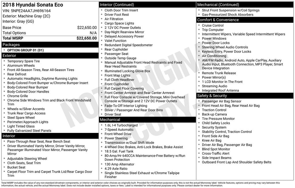 2018 Hyundai Sonata ECO FWD 7-Speed Automatic 1.6L I4 DGI Turbocharged DOHC 16V ULEV II 178hp Machine Gray