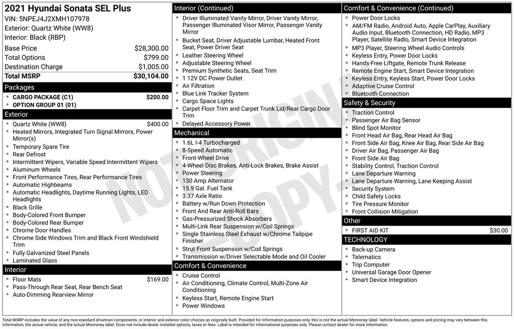 AM/FM radio: SiriusXM, Apple CarPlay & Android Auto, Auto High-beam Headlights, Dinamica Suede/Leatherette Seating Surfaces, Emergency communication system: Blue Link Connected Car Service (3-year complimentary subscription), Exterior Parking Camera Rear, Front dual zone A/C, Heated Front Bucket Seats, Illuminated entry, Remote keyless entry, Wireless Device Charging, 4-Wheel Disc Brakes, 6 Speakers, ABS brakes, Air Conditioning, Alloy wheels, Auto-dimming Rear-View mirror, Automatic temperature control, Brake assist, Bumpers: body-color, Cargo Hook, Cargo Net, Cargo Package, Carpeted Floor Mats, Delay-off headlights, Driver door bin, Driver vanity mirror, Dual front impact airbags, Dual front side impact airbags, Electronic Stability Control, First Aid Kit, Four wheel independent suspension, Front anti-roll bar, Front Bucket Seats, Front Center Armrest, Front reading lights, Fully automatic headlights, Garage door transmitter: HomeLink, Heated door mirrors, Heated front seats, Knee airbag, Low tire pressure warning, Occupant sensing airbag, Option Group 01, Outside temperature display, Overhead airbag, Overhead console, Panic alarm, Passenger door bin, Passenger vanity mirror, Power door mirrors, Power driver seat, Power steering, Power windows, Radio data system, Radio: AM/FM/MP3/HD/SiriusXM Display Audio, Rear anti-roll bar, Rear seat center armrest, Rear side impact airbag, Rear window defroster, Reversible Cargo Tray, Security system, Speed control, Speed-sensing steering, Speed-Sensitive Wipers, Split folding rear seat, Steering wheel mounted audio controls, Tachometer, Telescoping steering wheel, Tilt steering wheel, Traction control, Trip computer, Turn signal indicator mirrors, Variably intermittent wipers, Wheels: 19 x 8.0J Aluminum Alloy, AM/FM radio: SiriusXM, Apple CarPlay & Android Auto, Auto High-beam Headlights, Dinamica Suede/Leatherette Seating Surfaces, Emergency communication system: Blue Link Connected Car Service (3-year complimentary subscription), Exterior Parking Camera Rear, Front dual zone A/C, Heated Front Bucket Seats, Illuminated entry, Remote keyless entry, Wireless Device Charging.