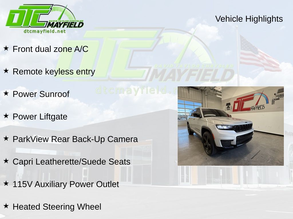 115V Auxiliary Power Outlet, 3rd Row Charge-Only USB Ports, Capri Leatherette/Suede Seats, Class IV Receiver Hitch, Cloth Seats, Front dual zone A/C, Heated Front Seats, Heated Steering Wheel, ParkView Rear Back-Up Camera, Power Liftgate, Power Sunroof, Remote keyless entry, Wireless Charging Pad, 180 Amp Alternator, 3.45 Rear Axle Ratio, 3rd row seats: split-bench, 4-Wheel Disc Brakes, 6 Speakers, 7 & 4 Pin Wiring Harness, ABS brakes, Air Conditioning, Alloy wheels, Altitude X, Anti-whiplash front head restraints, Automatic Headlamp Leveling System, Automatic temperature control, Black Headliner, Brake assist, Bumpers: body-color, Compass, Delay-off headlights, Delete Laredo Badge, Driver door bin, Driver vanity mirror, Dual Exhaust Tips, Dual front impact airbags, Dual front side impact airbags, Electronic Stability Control, Emergency communication system, Four wheel independent suspension, Front anti-roll bar, Front Bucket Seats, Front Center Armrest w/Storage, Front License Plate Bracket, Front reading lights, Fully automatic headlights, Gloss Black Exterior Accents, Heated door mirrors, Heavy-Duty Engine Cooling, Illuminated entry, Knee airbag, Low tire pressure warning, Manual Fold Seatbacks, MOPAR Finishing Package, MOPAR Front Splash Guards, MOPAR Paint Protection Film, MOPAR Rear Splash Guards w/Jeep Logo, Normal Duty Suspension, Occupant sensing airbag, Outside temperature display, Overhead airbag, Overhead console, Panic alarm, Passenger door bin, Passenger vanity mirror, Power door mirrors, Power driver seat, Power steering, Power windows, Quick Order Package 23M Altitude X, Radio data system, Radio: Uconnect 5 w/8.4" Display, Rain Sensitive Windshield Wipers, Rear air conditioning, Rear anti-roll bar, Rear Load Leveling Suspension, Rear reading lights, Rear window defroster, Rear window wiper, Reclining 3rd row seat, Remote Start System, Security system, Selectable Tire Fill Alert, Speed control, Speed-Sensitive Wipers, Split folding rear seat, Spoiler, Steering wheel mounted audio controls, Tachometer, Telescoping steering wheel, Tilt steering wheel, Traction control, Trailer Hitch Zoom, Trailer Tow Package, Trip computer, Variably intermittent wipers, Voltmeter, Wheels: 18" x 8.0" Fully Painted Aluminum, Wheels: 18" x 8.0" Fully Painted Aluminum 1, Wheels: 20" x 8.5" Gloss Black Painted Aluminum, 115V Auxiliary Power Outlet, 3rd Row Charge-Only USB Ports, Capri Leatherette/Suede Seats, Class IV Receiver Hitch, Cloth Seats, Front dual zone A/C, Heated Front Seats, Heated Steering Wheel, ParkView Rear Back-Up Camera, Power Liftgate, Power Sunroof, Remote keyless entry, Wireless Charging Pad.