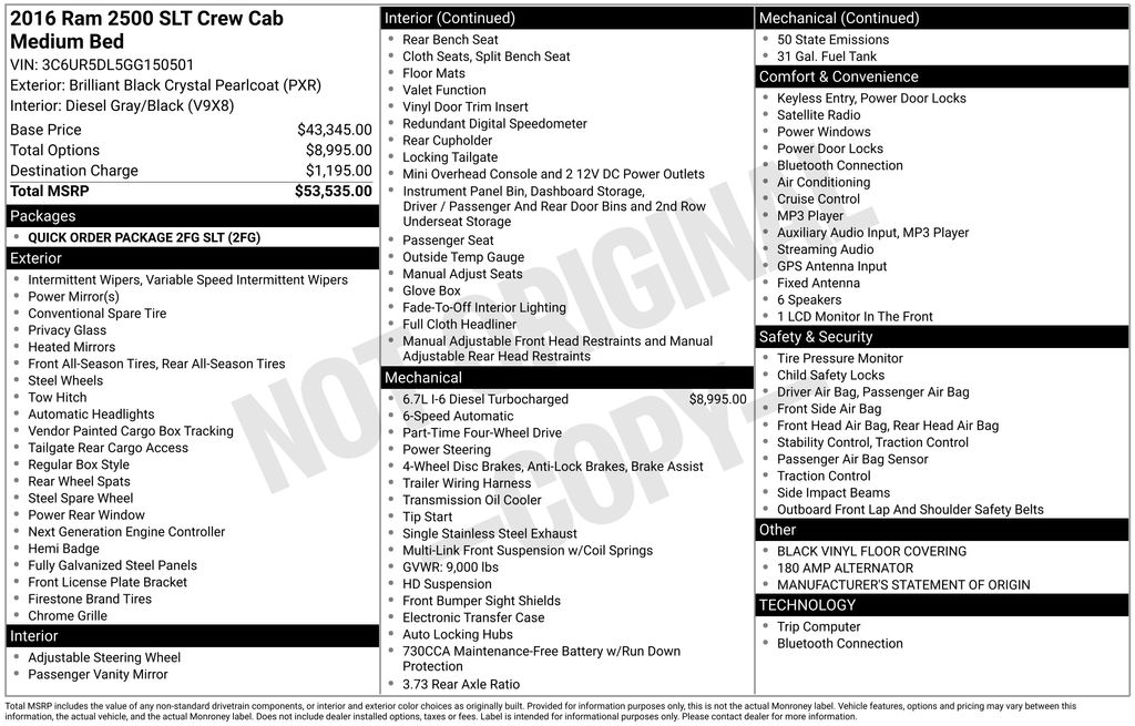 2016 Ram 2500 SLT 4WD 6-Speed Automatic Cummins 6.7L I6 Turbodiesel Brilliant Black Crystal Pearlcoat