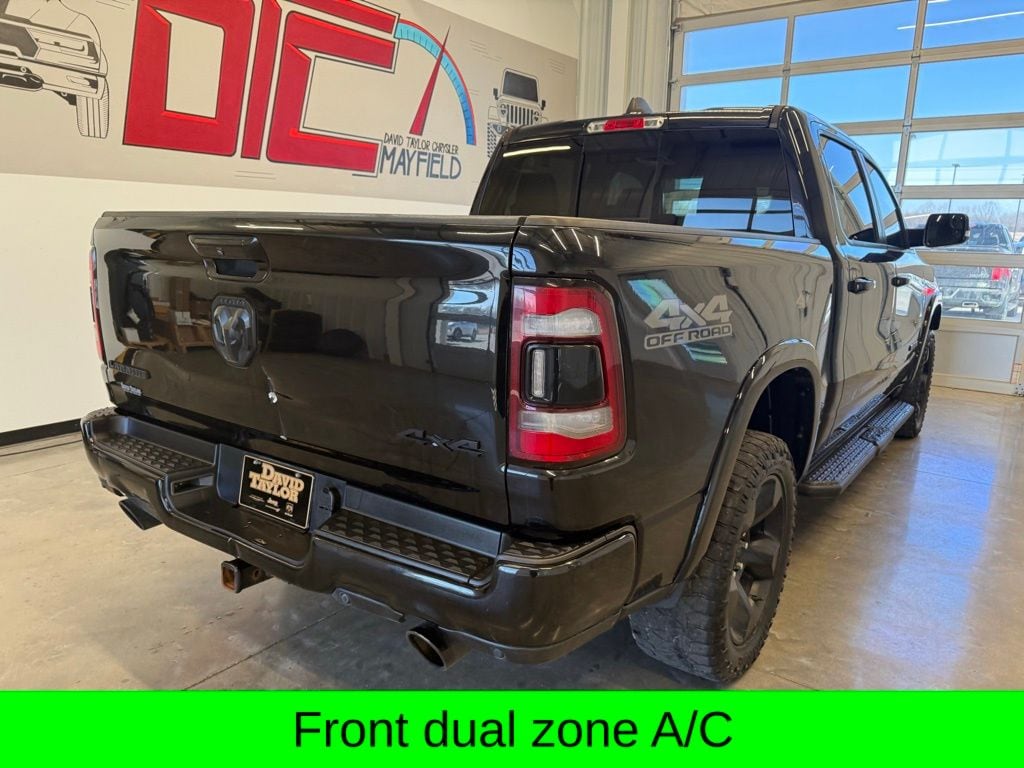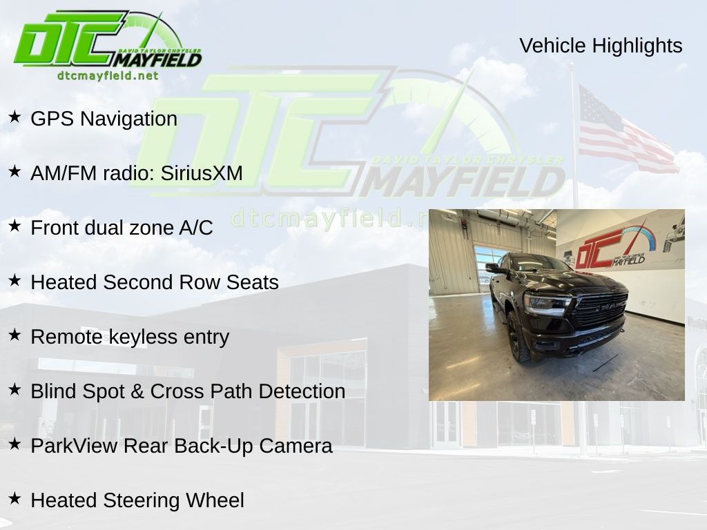 4G LTE Wi-Fi Hot Spot, AM/FM radio: SiriusXM, Apple CarPlay/Android Auto, Blind Spot & Cross Path Detection, Front dual zone A/C, GPS Navigation, Heated Front Seats, Heated Second Row Seats, Heated Steering Wheel, Integrated Voice Command w/Bluetooth, Leather Trim 40/20/40 Bench Seat, ParkView Rear Back-Up Camera, Remote keyless entry, Tow Hooks, Ventilated Front Seats, #1 Seat Foam Cushion, 1-Yr SiriusXM Guardian Trial, 10 Speakers, 12" Touchscreen Display, 26 Gal. Fuel Tank (Replace 23 Gal.), 3 Rear Seat Head Restraints, 3.21 Rear Axle Ratio, 4 Way Front Headrests, 4-Wheel Disc Brakes, 48V Belt Starter Generator, 5-Year SiriusXM Traffic Service, 5-Year SiriusXM Travel Link Service, 8.4" Touchscreen Display, ABS brakes, Accent Color Premium Power Mirrors, Adjustable pedals, Air Conditioning, Alloy wheels, Apple CarPlay, Audio memory, Auto Dimming Exterior Passenger Mirror, Auto High Beam Headlamp Control, Auto-dimming door mirrors, Auto-dimming Rear-View mirror, Automatic temperature control, Black Exterior Truck Badging, Black Headlamp Bezels, Black Interior Accents, Black Painted Exterior Mirrors Caps, Body Color Door Handles, Body Color Front Bumper, Body Color Rear Bumper w/Step Pads, Brake assist, Bucket Seats, Bumpers: chrome, Center Console Parts Module, Chrome Exterior Mirrors, Compass, Delay-off headlights, Disassociated Touchscreen Display, Driver door bin, Driver Seat Memory, Driver vanity mirror, Dual Exhaust w/Black Tips, Dual front impact airbags, Dual front side impact airbags, E-Locker Rear Axle, Electronic Stability Control, Foam Bottle Insert (Door Trim Panel), For Details, Visit DriveUconnect.com, For More Info, Call 800-643-2112, Front anti-roll bar, Front Center Armrest w/Storage, Front Extra HD Shock Absorbers, Front fog lights, Front reading lights, Front Seat Back Map Pockets, Front wheel independent suspension, Full Length Upgraded Floor Console, Fully automatic headlights, Garage door transmitter, Google Android Auto, GPS Antenna Input, Grille Surround 3 Black Texture 2 Black, HD Radio, Heated door mirrors, Heated front seats, Heated steering wheel, Hill Descent Control, Illuminated entry, Integrated Center Stack Radio, Laramie Level 2 Equipment Group (DISC), Leather steering wheel, Leather Trimmed Bucket Seats, Low tire pressure warning, Memory seat, Mopar Black Tubular Side Steps, MOPAR Front & Rear Rubber Floor Mats, Night Edition, Occupant sensing airbag, Off Road Decals, Off Road Group, Off-Road Information Pages, Outside temperature display, Overhead airbag, Overhead console, Panic alarm, ParkSense Front/Rear Park Assist w/Stop, Passenger door bin, Passenger vanity mirror, Pedal memory, Power 4-Way Driver Lumbar Adjust, Power 4-Way Passenger Lumbar Adjust, Power 8-Way Driver & Passenger Seats, Power door mirrors, Power driver seat, Power passenger seat, Power steering, Power windows, Quick Order Package 27H Laramie, Radio data system, Radio: Uconnect 12 w/Navigation, Radio: Uconnect 4 w/8.4" Display, Radio: Uconnect 4C Nav w/8.4" Display, Rain Sensitive Windshield Wipers, Rear 60/40 Folding Split Recline Seat, Rear anti-roll bar, Rear Extra HD Shock Absorbers, Rear seat center armrest, Rear step bumper, Rear Underseat Compartment Storage, Rear window defroster, Remote Tailgate Release, Security system, SiriusXM Radio Service, SiriusXM Satellite Radio, SiriusXM Traffic Plus, SiriusXM Travel Link, SiriusXM w/360L, Speed control, Split folding rear seat, Sport Performance Hood, Steering wheel mounted audio controls, Tachometer, Tailgate Ajar Warning Lamp, Telescoping steering wheel, Tilt steering wheel, Traction control, Trailer Brake Control, Trip computer, Turn signal indicator mirrors, USB Host Flip, Variably intermittent wipers, Ventilated front seats, Voltmeter, Wheels: 18" x 8" Aluminum Base Painted, Wheels: 20" x 9" Cast Aluminum Black, 4G LTE Wi-Fi Hot Spot, AM/FM radio: Siriu
