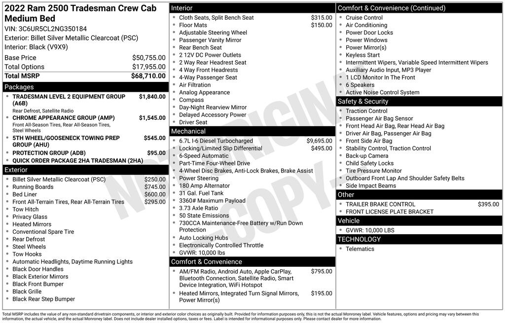 17" x 7.5" Steel Styled Wheels, 2 Way Rear Headrest Seat, 3.73 Axle Ratio, 4 Way Front Headrests, 4-Wheel Disc Brakes, 40/20/40 Split Bench Seat, 4G LTE Wi-Fi Hot Spot, 5th Wheel/Gooseneck Towing Prep Group, 6 Speakers, 8.4" Touchscreen Display, ABS brakes, Active Noise Control System, Air Conditioning, All R1 Low Radios, All Radio Equipped Vehicles, AM/FM radio, Anti-Spin Differential Rear Axle, Apple CarPlay, Black Exterior Mirrors, Bluetooth Handsfree Phone & Audio, Brake assist, Bright Front Bumper, Bright Rear Bumper, Carpet Floor Covering, Center Hub, Chrome Appearance Group, Chrome Flat Wheel-to-Wheel Side Steps, Chrome Grille Surround, Cloth 40/20/40 Bench Seat, Cluster 3.5" TFT Color Display, Compass, Connectivity - US/Canada, Delay-off headlights, Driver door bin, Dual front impact airbags, Dual front side impact airbags, Electronic Stability Control, Electronically Controlled Throttle, Emergency communication system: SiriusXM Guardian, Exterior Mirrors Courtesy Lamps, Exterior Mirrors w/Heating Element, Exterior Mirrors w/Supplemental Signals, For Details, Visit DriveUconnect.com, Front anti-roll bar, Front Armrest w/Cupholders, Front Center Armrest w/Storage, Front License Plate Bracket, Front reading lights, Fully automatic headlights, Global Telematics Box Module (TBM), Google Android Auto, GPS Antenna Input, Heated door mirrors, Heavy Duty Vinyl 40/20/40 Split Bench Seat, Illuminated entry, Integrated Center Stack Radio, Integrated Voice Command w/Bluetooth, Low tire pressure warning, Manual Adjust 4-Way Driver Seat, Manual Adjust 4-Way Front Passenger Seat, Matte Black Mesh Grille w/Chrome, Mirror Running Lights, MOPAR Front & Rear Rubber Floor Mats, MOPAR Spray In Bedliner, Occupant sensing airbag, Outside temperature display, Overhead airbag, Overhead console, ParkView Rear Back-Up Camera, Passenger door bin, Passenger vanity mirror, Power Adjust & Heated Black Tow Mirrors, Power door mirrors, Power steering, Power windows, Protection Group, Quick Order Package 2HA Tradesman, Radio data system, Radio: Uconnect 3 w/5" Display, Radio: Uconnect 5 W w/8.4" Display, Rear anti-roll bar, Rear Folding Seat, Rear Power Sliding Window, Rear step bumper, Rear Window Defroster, Selectable Tire Fill Alert, SiriusXM Radio Service, SiriusXM Satellite Radio, Speed control, Storage Tray, Tachometer, Tilt steering wheel, Tip Start, Tow Hooks, Traction control, Tradesman Level 2 Equipment Group, Trailer Brake Control, Trailer Light Check, Trailer Tow Mirrors, Variably intermittent wipers, Vendor Painted Cargo Box, Vendor Painted Cargo Box Tracking, Voltmeter, Wheels: 18" x 8.0" Steel Chrome Clad.