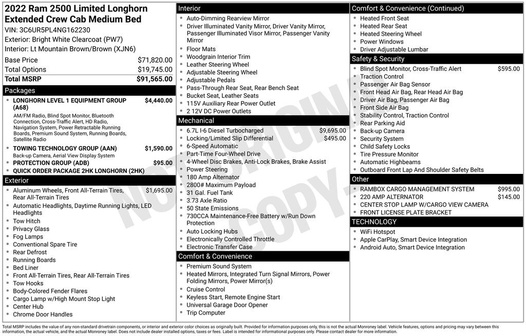 2022 Ram 2500 Longhorn 4WD 6-Speed Automatic Cummins 6.7L I6 Turbodiesel Bright White Clearcoat