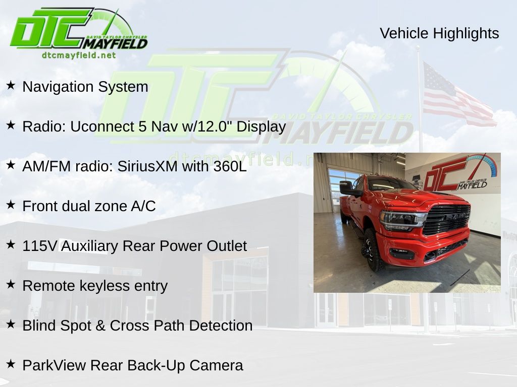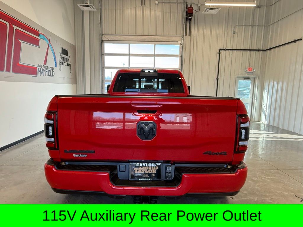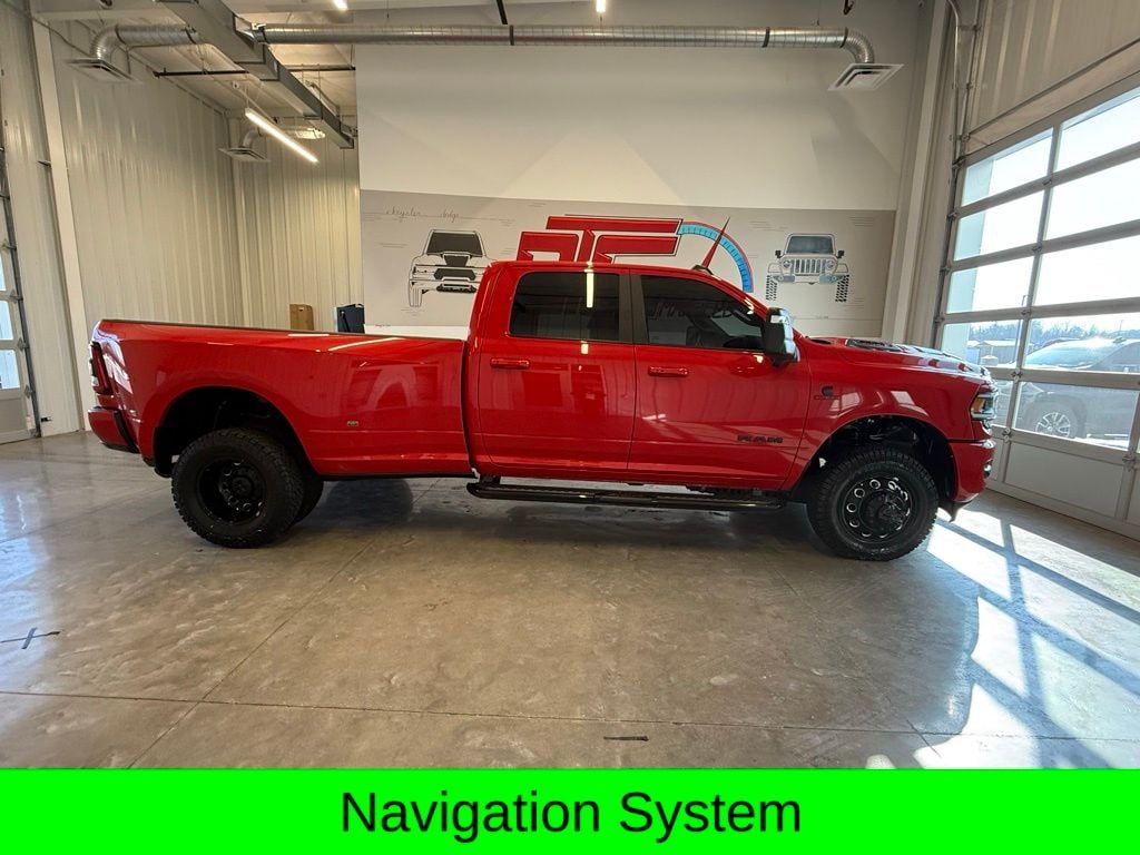 115V Auxiliary Rear Power Outlet, 12" Touchscreen Display, 4G LTE Wi-Fi Hot Spot, 5th Wheel/Gooseneck Towing Prep Group, 8.4" Touchscreen Display, AM/FM radio: SiriusXM with 360L, Apple CarPlay/Android Auto, Blind Spot & Cross Path Detection, Dual Rear Wheels, Front dual zone A/C, Heated Front Seats, Heated Steering Wheel, Integrated Voice Command w/Bluetooth, Leather Trim 40/20/40 Bench Seat, Navigation System, ParkView Rear Back-Up Camera, Radio: Uconnect 5 Nav w/12.0" Display, Remote keyless entry, 10 Speakers, 17 Speaker harman/kardon Premium Sound, 2 Way Rear Headrest Seat, 220 Amp Alternator, 3.73 Axle Ratio, 4 Way Front Headrests, 4-Wheel Disc Brakes, 50 Gallon Fuel Tank, 6000# Front Axle w/Hub Ext, ABS brakes, Active Noise Control System, Air Conditioning, Alexa Built-In, Alloy wheels, Apple CarPlay, Auto Dimming Exterior Passenger Mirror, Auto High Beam Headlamp Control, Auto Power-Folding Mirrors, Auto-dimming Rear-View mirror, Automatic temperature control, Black Headlamp Bezels, Black RAM Head Tailgate Badge, Black Tail Lamp Bezels, Black Wheel Center Hub, Box & Rear Fender Clearance Lamps, Brake assist, Bumpers: body-color, Center Hub, Clearance Lamps, Cluster 12" TFT Color Display, Compass, Connected Travel & Traffic Services, Connectivity - US/Canada, CTR Stop Lamp w/Cargo View Camera, Delay-off headlights, Disassociated Touchscreen Display, Driver door bin, Driver vanity mirror, Dual front impact airbags, Dual front side impact airbags, Electronic Stability Control, Electronically Controlled Throttle, Exterior Mirrors Courtesy Lamps, Exterior Mirrors w/Heating Element, Exterior Mirrors w/Memory, Exterior Mirrors w/Supplemental Signals, Folding Flat Load Floor Storage, For Details Visit DriveUconnect.com, For More Info, Call 800-643-2112, Front anti-roll bar, Front Center Armrest w/Storage, Front LED Fog Lamps, Front reading lights, Front Seat Back Map Pockets, Fully automatic headlights, Garage door transmitter, Global Telematics Box Module (TBM), Gloss Black Grille Billets/Accents, Google Android Auto, GPS Antenna Input, GPS Navigation, HD Radio, Heated door mirrors, Heated front seats, Heated Second Row Seats, Heated steering wheel, High Back Seats, Illuminated entry, Integrated Center Stack Radio, Laramie Level B Equipment Group, Leather steering wheel, LED Tail Lamps, Low tire pressure warning, Mirror Running Lights, Night Edition, Occupant sensing airbag, Off-Road Information Pages, Outside temperature display, Overhead airbag, Overhead console, Painted Flat Cab-Length Side Steps, Panic alarm, ParkSense Front/Rear Park Assist System, Passenger door bin, Passenger vanity mirror, Power 8-Way Adjustable Passenger Seat, Power Adjust 8-Way Driver Seat, Power Adjust Mirrors, Power door mirrors, Power driver seat, Power passenger seat, Power steering, Power Telescoping Mirrors, Power windows, Power-Adjustable Convex Aux Mirrors, Quick Order Package 21H Laramie, Radio data system, Radio: Uconnect 5 Nav w/8.4" Display, Rain Sensitive Windshield Wipers, Rear 60/40 Folding Seat, Rear reading lights, Rear seat center armrest, Rear step bumper, Rear Window Defroster, Remote Tailgate Release, Security system, Selectable Tire Fill Alert, SiriusXM Radio Service, SiriusXM w/360L, Speed control, Split folding rear seat, Sport Performance Hood, Steering wheel mounted audio controls, Surround View Camera System, Tachometer, Tilt steering wheel, Tip Start, Towing Technology Group, Traction control, Trailer Tow Pages, Trip computer, Turn signal indicator mirrors, Variably intermittent wipers, Voltmeter, Wheels: 17" x 6.0" Black Machined Aluminum, Wheels: 17" x 6.0" Polished Aluminum, Wheels: 18" x 8.0" Polished Aluminum, 115V Auxiliary Rear Power Outlet, 12" Touchscreen Display, 4G LTE Wi-Fi Hot Spot, 5th Wheel/Gooseneck Towing Prep Group, 8.4" Touchscreen Display, AM/FM radio: SiriusXM with 360L, Apple CarP